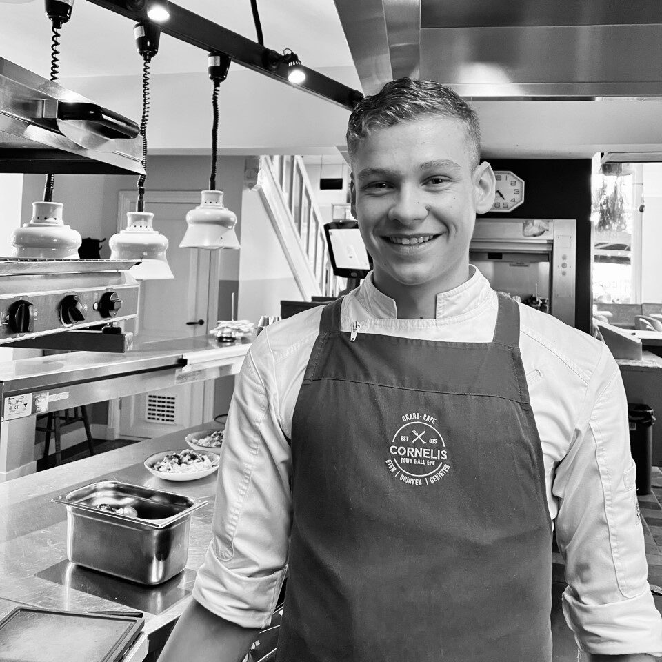 DEZE JONGEMAN KOMT ZIJN LAATSTE LEERJAAR VAN DE KOKSOPLEIDING BIJ CORNELIS DOEN. HET AFRONDEN VAN ZIJN STUDIE GAAN WIJ HOPELIJK MEEMAKEN! INMIDDELS DRAAIT HIJ VOLWAARDIG MEE AAN DE GARDE EN KUNNEN WE HEM EIGENLIJK AL NIET MEER MISSEN!