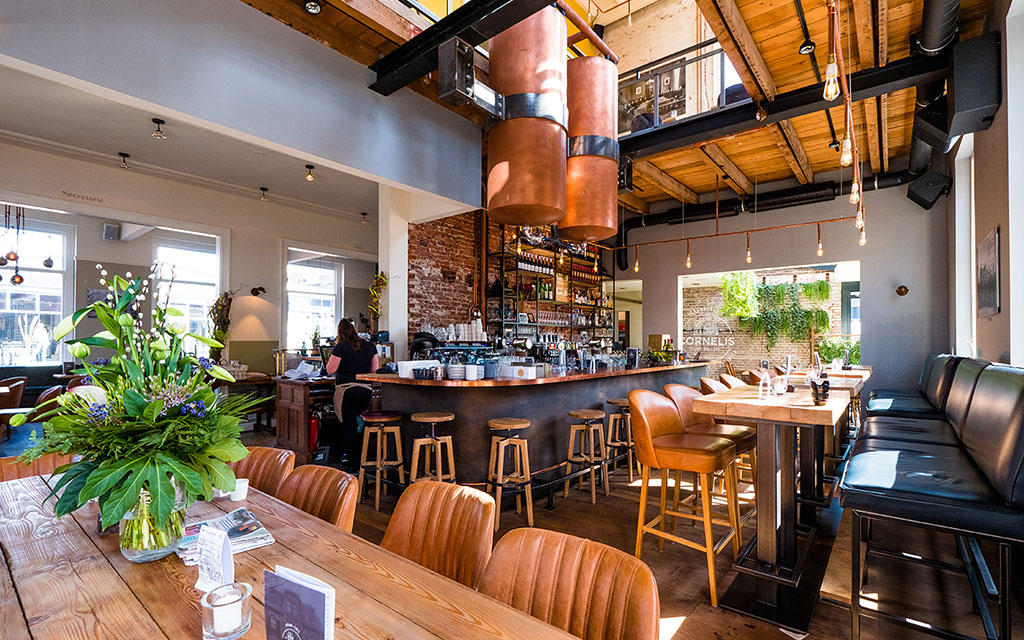 Met de techniek van nu hebben wij de tanks dwars door de verdieping gestoken en kunt u zo meters hoog door de vide na het plafond van de oude raadzaal kijken. De tanks zijn gevuld met maar liefst 500 liter Grolsch bier per tank! Onder de bar zit een groot koelsysteem waarmee we uw tapbiertje heerlijk koel kunnen serveren. Zeker weten dat Cornelis een echte bierliefhebber was! Het momentje genieten maken wij voor onze gasten bij Cornelis nu heel bijzonder omdat u het sfeertje van toen, nu kunt beleven met onze fraaie koperen biertanks boven uw hoofd.